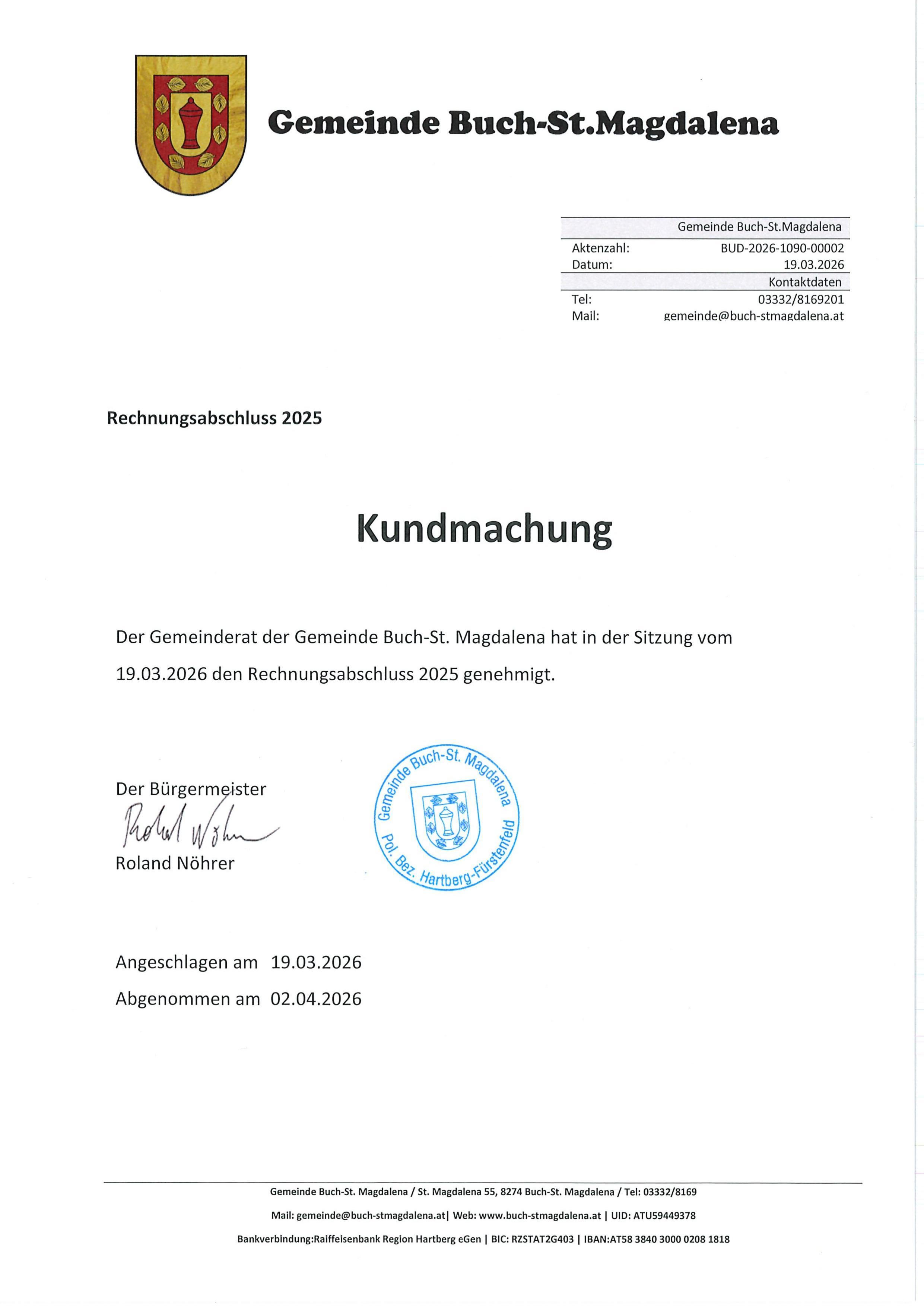 Kundmachung Rechnungsabschluss 2025, Beschluss