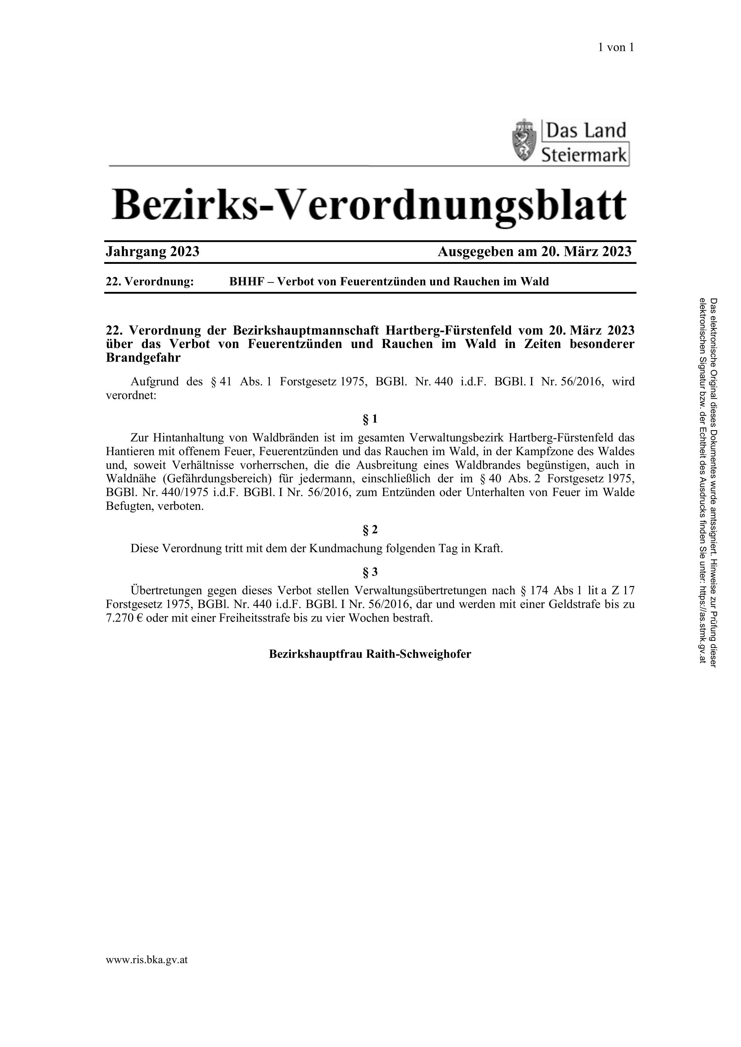 Verordnung über das Verbot von Feuerentzünden und Rauchen im Wald in Zeiten besonderer Brandgefahr.